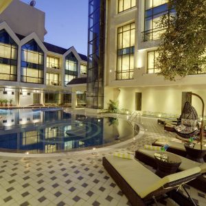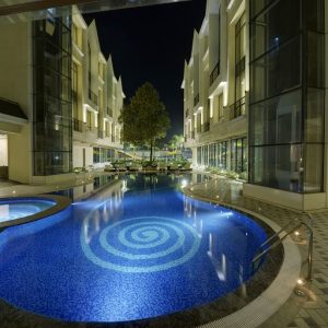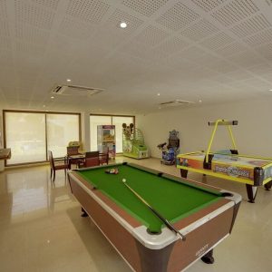 For those who prefer a more active way to relax, our swimming pool with a waterfall feature, jacuzzi, and fitness center offer the perfect blend of fun and fitness. Children can enjoy themselves in the dedicated kids’ play area or splash around in the kids’ pool, while parents bask in the sun by the poolside.